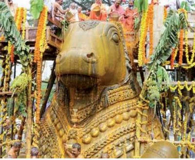 சாமுண்டி மலையில் 15 அடி உயர நந்திக்கு மஹாமஸ்தகா அபிஷேகம்!