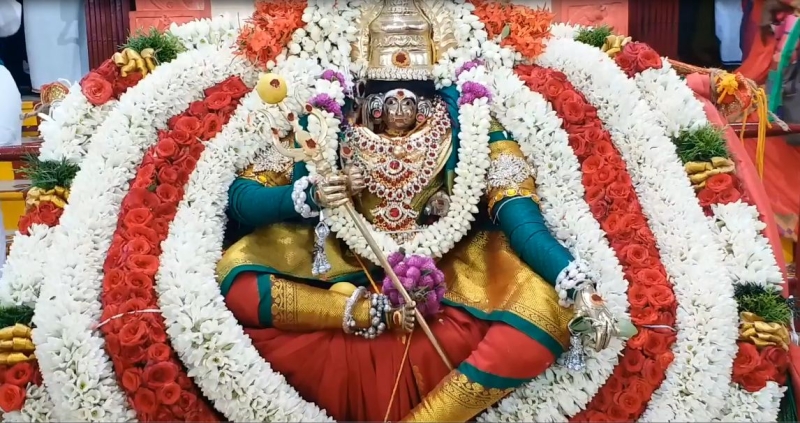 அதைத் தொடர்ந்து உற்சவர் அம்மனுக்கு வண்ண பட்டு உடுத்தி மலர்மாலைகளால் சிறப்பாக அலங்கரிக்கப்பட்டு இருந்தார். பின்னர் வண்ண மலர்களால் அலங்கரித்து காட்சியளிக்கப்பட்டிருந்த தேரின் மீது கலசத்தை ஆலயத்திலிருந்து எடுத்து வந்து தேரின் உச்சியில் வைத்தனர். பின்னர் உற்சவர் அம்மனுக்கு சிறப்பு பூஜைகள் செய்து தீபாராதனை காட்டப்பட்டு சிவாச்சாரியார்கள் தோலில் சுமந்து கொண்டு திருத்தேரில் அமர்த்தினர்.