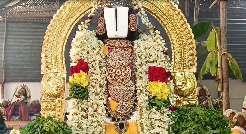 முன்னதாக நான்காம் கால யாக சாலை பூஜையில் பல்வேறு நதிகளிலிருந்து கொண்டுவரப்பட்ட புனித நீரை கலசத்தில் வைத்து கணபதி பூஜை, விக்னேஸ்வர பூஜை, வாஸ்து சாந்தி, பிரவேசபலி, திரவ்யாஹீதீ, நாடிசந்தனம், தத்வார்சனை, ஸ்பர்சாஹூதி, ஆகியவை தொடர்ந்து அதிகாலை கோ பூஜை, நாடி சந்தனம், மகாபூர்ணஹூதி உள்ளிட்டவை நடைபெற்றது அதைத்தொடர்ந்து வேத பட்டாச்சாரியார்கள் பெருமாள் நாமம் பதித்த கலசத்தை தலையில் சுமந்து ஆலயம் முழுவதும் கடம் புறப்பாடு நடைபெற்று ராஜ விமான கோபுரத்திற்கு சிறப்பு மங்கள சிறப்பு பூஜைகள் செய்து அஷ்டபந்தன ஸமஹா கும்பாபிஷேகம் நடைபெற்று கலசத்திற்கு தீபாரதனை காண்பிக்கப்பட்டது.
