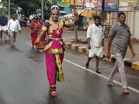 இதனை ஏராளமான பொதுமக்கள் மற்றும் பக்தர்களும் இந்த பரதநாட்டிய கிரிவலத்தை சென்றபடி பாராட்டி ரசித்து சென்றனர்.