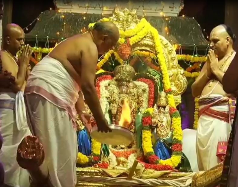 பின்னர் கோவிலுக்குள் இருக்கும் கொடிமரத்தின் வேத பண்டிதர்கள் மற்றும் கோவில் அர்ச்சகர்கள் ஆகம சகிஸ்திரத்தின்படி பூமாலைக்கு கருடஓவியம் கொண்ட துணியை சுற்றி சிறப்பாக கொடியேற்றத்தை நடத்தினர். இந்த கொடியேற்றத்துடன் பிரம்மோற்சவம் தொடங்கியது.