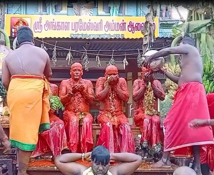 ஆரோவில் அடுத்த ஆலங்குப்பம் அங்காளபரமேஸ்வரி அம்மன் கோவில் மயானக்கொள்ளை விழாவை முன்னிட்டு கடந்த வாரம் கொடி ஏற்றத்துடன் துவங்கியது. விழாவையொட்டி இன்று தேர்வு செய்யப்பட்ட பக்தர்களுக்கு 50 கிலோ மிளகாய் பொடி அபிஷேகம் மற்றும் தயிர், எலும்பிசை,மஞ்சள்,பால், இளநீர், உள்ளிட்ட ஆறு வகையான சிறப்பு அபிஷேகம் வெகு விமர்சையாக நடைபெற்றது. இதில் பல்வேறு பகுதிகளில் இருந்து பக்தர்கள் கலந்து கொண்டனர். விழாவிற்கான ஏற்பாடுகளை பஞ்சாயத்தார்கள் மற்றும் ஊர் பொது மக்கள் செய்துள்ளனர்.