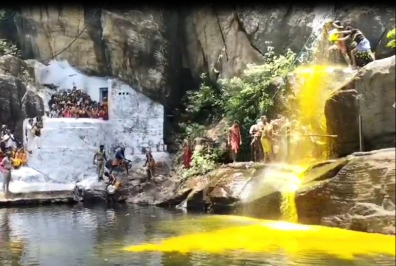 மஞ்சளாக கொட்டிய அருவி நீரில் செண்பகாதேவி அம்மனுக்கு நடைபெற்ற தீர்த்தவாரி...
