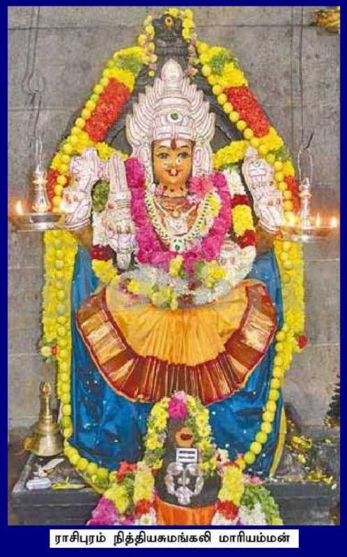 சித்தர்கள் வாழ்ந்ததாக கூறப்படும் அலவாய்மலை, போதமலை நயினாமலை ஆகிய நான்கு மலைகள் சூழ்ந்திருக்க நடுவே அமைந்துள்ளது நாமக்கல் மாவட்டத்தில் உள்ள ராசிபுரம். இந்த ராசிபுர சலையில் கிழக்கு பார்த்த சன்னதியாக காட்சியளிப்பதுதான் பிரசித்தி பெற்ற நித்திய சுமங்கலி மாரியம்மன் கோவில். சுமார் 350 ஆண்டுகள் பழமையான இந்த கோவில் கடையேழு வள்ளல்களில் ஒருவரான வல்வில் ஓரி காலத்தில் கட்டப்பட்டது.