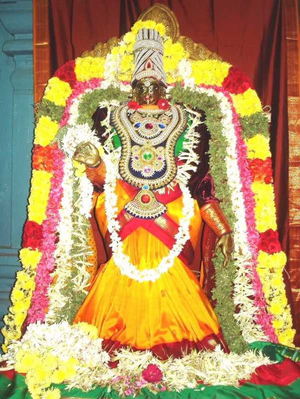 இத்திருக்கோயிலில் அர்ச்சகர் சிவந்த ஆடை உடுத்தி அம்பாளுக்கு அர்ச்சனை செய்கிறார். அன்னையை தரிசித்து விட்டு கோயிலைச் சுற்றிவந்தால், சிறிய சிறிய விமானத்துடன் கூடிய மண்டபங்களில் சரஸ்வதி, ஆஞ்சநேயர், துர்க்கை காணப்படுகிறார்கள். துர்க்கையின் எதிரில் ஏராளமான எலுமிச்சைபழ மூடி விளக்குள் ஏற்றப்படுகிறது.