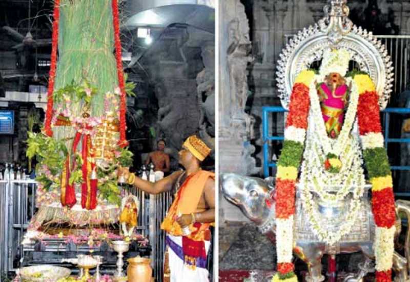 கொடியேற்ற நிகழ்ச்சியையொட்டி காலை 10.10 மணிக்கு மூஷிக வாகனம் பொறிக்கப்பட்டுள்ள வெண்கொடி கோயிலை வலம் வந்தது. உடன் புதிதாக செய்யப்பட்ட வெள்ளி சிம்ம வாகனத்தில் கும்பம் வலம் வந்தது. பின்னா் கொடிமரத்தில் வலம் வரப்பட்ட வெண்பட்டு சுற்றப்பட்டு கொடி மரத்திற்கான சிறப்பு பூஜையும், அங்குசதேவருக்கு சிறப்பு பூஜையும் நடத்தப்பட்டு கொடியேற்றம் நடைபெற்றது. இதில் ஏராளமான பக்தா்கள் கலந்துகொண்டு சாமி தரிசனம் செய்தனா்.