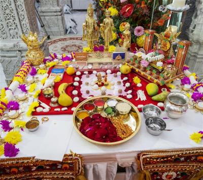 அருகம்புல் மாலை அணிவித்து நெய்தீபம் காட்டி வணங்கி மூன்று முறை வலம் வரவேண்டும்.