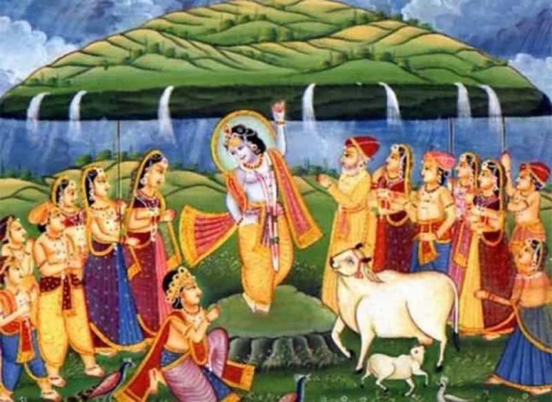 தன் மக்களை காக்கும் பொருட்டு, கோவர்த்தன மலையையே தூக்கினார் கிருஷ்ணர். அதை தன் சுண்டுவிரலால் தாங்கிப் பிடித்தார். அது ஒரு குடைபோல் மாறிப்போனது. அந்த பிரமாண்ட மலை குடையின் கீழ், பிருந்தாவன மக்களும், கால்நடைகளும் அடைக்கலம் புகுந்தனர்.