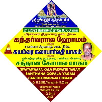 வேலூர் மாவட்டம் வாலாஜாபேட்டையில் அமைந்துள்ள ஸ்ரீ தன்வந்திரி யாக பீடத்தில் மஹோத்சவம் 2019 என்ற தலைப்பில் முப்பெரும் விழா நடைபெற்றது இதில் உலக நன்மை வேண்டியும் விவசாயம் செழித்தோங்க பருவகால மழையை வேண்டியும் 16 தெய்வங்களுக்கு ஒரே முகூர்த்தத்தில் ஒரே மேடையில் திருக்கல்யாணமும் மற்றும் தன்வந்திரி யாக பீடத்தின் பதினைந்தாம் ஆண்டு கல்வெட்டு திறப்பு விழாவும் மேலும் தன்வந்திரியாக பீடத்தை 58வது ஜெயந்தி விழா என்பன உள்ளிட்ட முப்பெரும் விழா கலந்த நிகழ்ச்சி வெகுவிமற்சியாக நடைபெற்று வருகிறது.