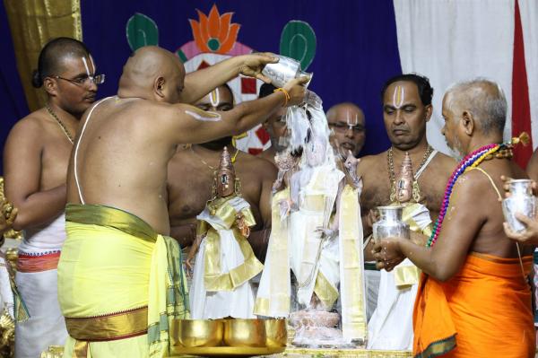 இதில் பால், தயிர், தேன், இளநீர் உள்ளிட்ட மூலிகை திரவியங்களால் கோயில் ஜீயர்கள் முன்னிலையில் வேத மந்திரங்கள் முழங்க அபிஷேகம் நடந்தது. இதைதொடர்ந்து மாலை உற்சவர்களுக்கு வைர கவசம் அணிவிக்கப்பட்டு நான்கு மாட வீதியில் உலா வந்து பக்தர்களுக்கு அருள்பாலித்தனர். 2வது நாளான நாளை முத்து கவசம் அணிவிக்கப்பட்டு சுவாமி வீதி உலா நடைபெற உள்ளது.