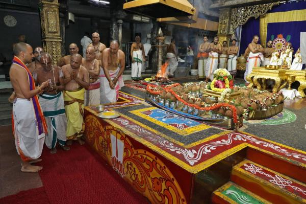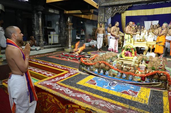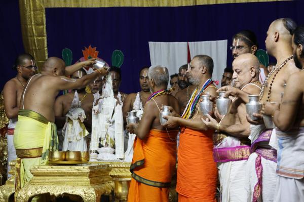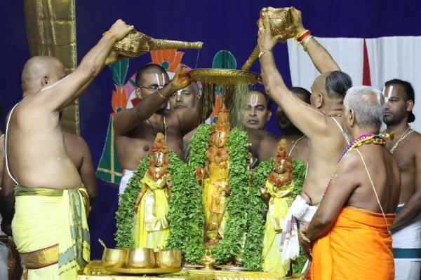 அதன்படி இந்தாண்டு 3நாட்கள் நடைபெறும் ஜேஷ்டாபிஷேகத்தையொட்டி ஸ்ரீதேவி, பூதேவி சமேத மலையப்ப சுவாமிக்கு அணிவிக்கப்பட்டிருக்கும் தங்க கவசங்கள் அகற்றப்பட்டு பஞ்சலோக சிலைகள் சேதம் ஏற்படாமல் இருக்க மூலிகை திரவியங்களால் ரங்கநாதர் மண்டபத்தில் சிறப்பு யாகமும், அபிஷேகமும் நடத்தப்பட்டது.