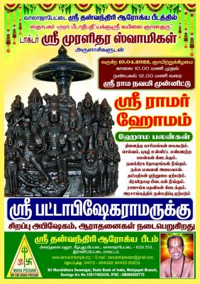 வேலூர் மாவட்டம் வாலாஜாபேட்டை ஸ்ரீ தன்வந்திரி ஆரோக்ய பீடத்தில் ஸ்தாபகர் மற்றும் பீடாதிபதி “யக்ஞஸ்ரீ கயிலை ஞானகுரு” டாக்டர் ஸ்ரீ முரளிதர ஸ்வாமிகள் அருளானைப்படி வருகிற 09.08.2019 வெள்ளிக்கிழமை வரலட்சுமி நோன்பு விரத நாளில் காலை 10.00 மணி முதல் 12.00 மணி வரை சுமங்கலிப் பெண்களின் நலன் கருதியும், கன்னிப் பெண்களின் நலன் கருதியும் மகாவிஷ்ணுவின் தேவியான இலட்சுமி தேவியை அனுஷ்டிக்கும் விதத்திலும் பாக்யலக்ஷ்மி ஹோமம் நடைபெறுகிறது.