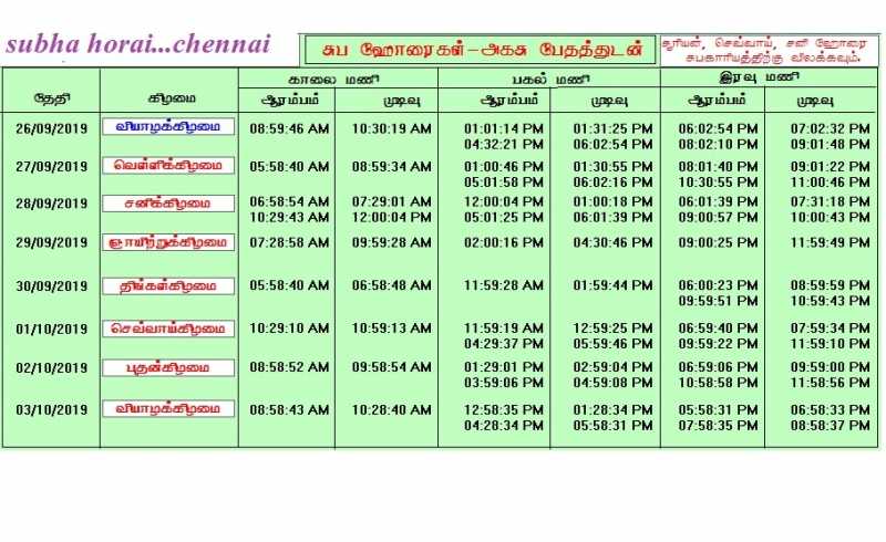 இங்கு கொடுக்கப்பட்டுள்ள சுபஹோரை.. நல்ல நேரம் சென்னையில் வசிக்கும் அன்பர்களுக்கு மிகவும் உபயோகமாக இருக்கும்.சரியான ராகு காலம் ,எமகண்டம் (பகல் காலத்தில், இரவு காலத்தில் )போன்ற நேரங்கள் சென்னைக்கு கணித்துக் கொடுக்கப்பட்டுள்ளது.