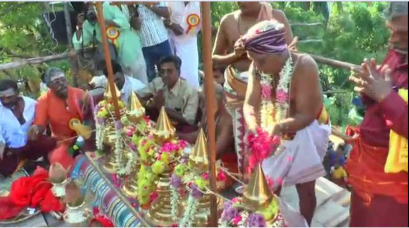 புனிதநீர் கலசங்களுக்கு ஊற்றப்பட்டது மூன்று நாட்கள் தொடர்ந்து நடைபெறும் யாகசாலை பூஜைகள் இன்று அதிகாலை மீண்டும் தொடங்கப்பட்டு பூர்ணாஹுதி நிறைவுபெற்று சிவாச்சாரியர்கள் கலச நீரை தலையில் சுமந்து மேளதாளத்துடன் ஊர்வலமாக சென்றனர்.