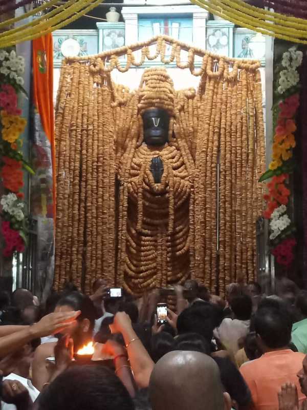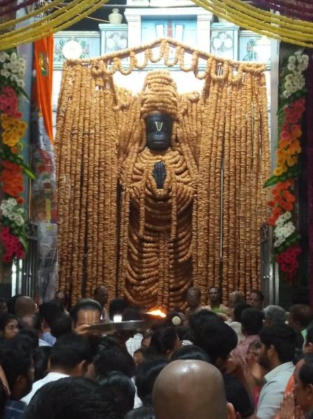 காலை 10 மணி வரை வடை மாலை அலங்காரத்தில் பக்தர்களுக்கு அருள்பாலிக்கும் ஆஞ்சநேயர்க்கு பின்னர் மஞ்சள்,சந்தனம்,பன்னீர்,தயிர்,பால்,தேன்,திருமஞ்சனம் உள்ளிட்ட பல்வேறு வகையான வாசனை திரவியங்களை கொண்டு அபிஷேகம் செய்யப்பட்டவுள்ளது..இதனையடுத்து பிற்பகல் 1 மணிக்கு தங்க கவச அலங்காரத்தில் ஆஞ்சநேய சுவாமி பக்தர்களுக்கு அருள்பாலித்தார்.