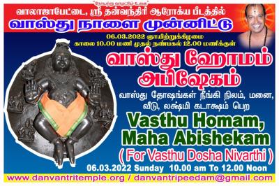 தொடர்ந்து ஏழாவது நாளான நாளை 07.01.2020 செவ்வாய்கிழமை குடும்ப விருக்தி, வீட்டில் நஷ்ட நிலை நீங்கி லாபங்கள் பெருகவும். சொந்த வீடு, வாகனம் போன்ற யோகங்கள் அமையவும் ஸ்ரீ மஹா விஷ்ணு ஹோமமும், சிறப்பு பூஜைகளும் நடைபெற உள்ளது. இவ்வைபவம் வருகிற 31.12.2020 நடைபெற உள்ளது. இதில் அனைவரும் பங்கேற்று இறையருளுடன் குருவருள் பெற அன்புடன் அழைக்கின்றோம். இந்த தகவலை தன்வந்திரி குடும்பத்தினர் தெரிவித்தனர்.