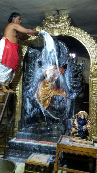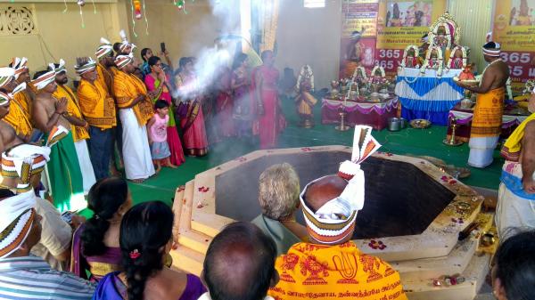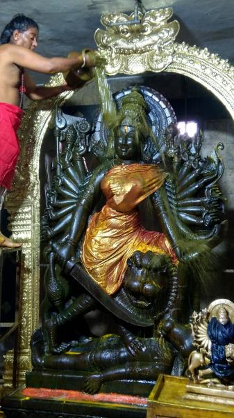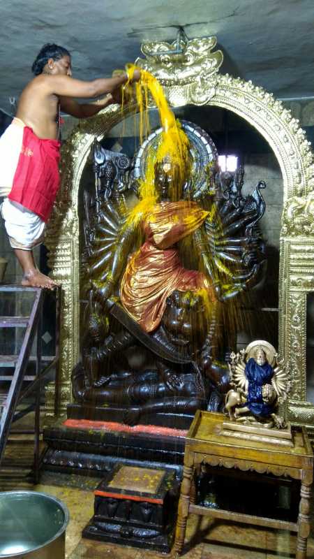 இதில் மங்கள இசை, கோ பூஜை, விநாயகர் பூஜை, நாங்காம் கால யாக பூஜை, பாராயணங்கள் நடைபெற்றது. தொடர்ந்து நெய், தேன், மூலிகைகள், பூசணிக்காய், புஷ்பங்கள், பழங்கள், மஞ்சள், குங்குமம், சௌபாக்ய பொருட்கள், பட்டு வஸ்திரங்கள், பலகாரங்கள், இனிப்பு வகைகள் மேலும் பல்வேறு திரவியங்கள் சமர்ப்பிக்கபட்டு மஹா பூர்ணாஹுதி நடைபெற்றது. தொடர்ந்து ஸ்ரீ மஹிஷாசுர மர்த்தினிக்கு பால், தயிர், சந்தனம், மஞ்சள், திரவியப்பொடி, பன்னீர் போன்ற பல்வேறு திரவியங்களால் மஹா அபிஷேகம் நடைபெற்றது.