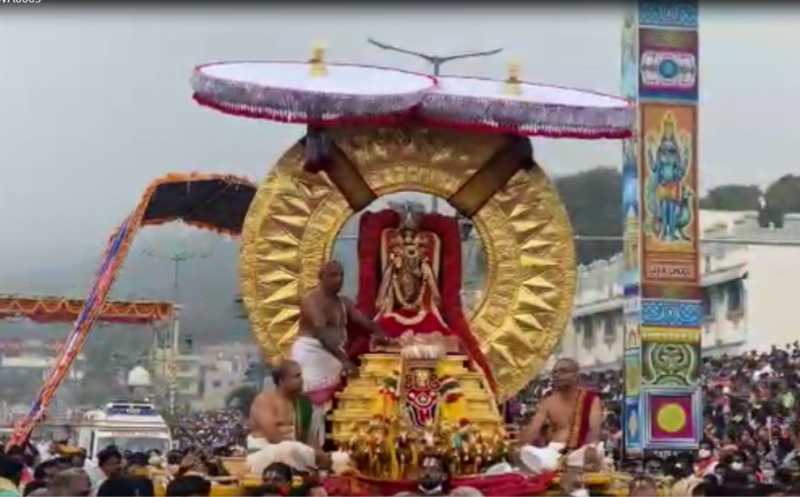 திருப்பதி ஏழுமலையான் கோயிலில் ரதசப்தமியையொட்டி அதிகாலை 5.30 மணிக்கு தங்க சூரிய பிரபை வாகனத்தில் மலையப்ப சுவாமி வாகன மண்டபத்தில் இருந்து சூரிய பிரபை வாகனத்தில் எழுந்தருளி நான்கு மாடவீதியில் வலம் வந்தார். வடக்கு மாடவீதியில் சூரிய உதயத்திற்காக மலையப்ப சுவாமி காத்திருந்து சூரிய கதிர்கள் சுவாமி மீது விழுந்தபோது பக்தர்களின் கோவிந்தா கோவிந்தா என்ற கோஷத்துக்கு மத்தியில் சிறப்பு ஆரத்தி வழங்கப்பட்டது.