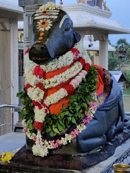 "This feature is believed to be the force behind the peacefulness one observes while entering this temple. Unlike in other temples, we do not allow the devotees to speak their prayers in Naandhi Bhagavan's ears because we do not want to disturb his dhyana", says the temple's High Priest Mr. Kannan.
