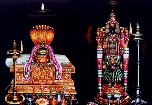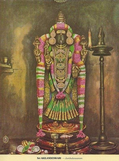 The sannadhi of the Akilandeshwari and the sannadhi of Prasanna Vinayaka are in the shape of the pranava manthra symbol "Om". Like in Kanchipuram, Saint Adi Shankara pacified the anger of the Goddess here too. But instead of establishing Sri Chakra, he installed a pair of Sri Chakra thadangas (ear rings with the power of Sri Chakra) to pacify angry Goddess Akilandeswari. To ensure that she remains in a Sowmya Shantha Swaroopam (merciful form), Adi Shankara installed shrines of her sons Ganesha and Murugan in front of her, as a mother she cannot afford to be angry towards her kids.