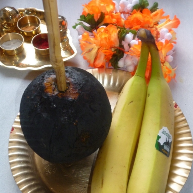 பின்பு அதில் பொடி செய்யப்பட்ட வெல்லம், பொட்டுக்கடலை, அரிசி, எள்ளு விதைகள், ஏலக்காய் பொடி, சர்க்கரை மற்றும் பாதி தேங்காய் நீரை ஊற்றிக் கொள்ளுங்கள்.தேங்காய் முழுமையாக நிரப்பப்பட்டதும், பெருவிரலால் துளையை மறைத்துக் கொண்டு, தேங்காயை நீரில் கழுவுங்கள்.