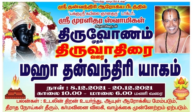இப்பீடத்தில் ஸ்தாபகர் மற்றும் பீடாதிபதியக் ஞஸ்ரீகயிலை ஞானகுரு டாக்டர் ஸ்ரீமுரளிதரஸ்வாமிகள் அருளாசிகளுடன் வருகின்ற 8.12.2021 புதன்கிழமை பெருமாளுக்கு உகந்த திருவோணம் நட்சத்திரம் முதல் 20.12.2021 ஈஸ்வரனுக்கு உகந்த திருவாதிரை நட்சத்திரம் வரை தினமும்காலை 10.00 மணிமுதல்மாலை 06.00 மணிவரை உலகமக்கள் ஆரோக்யம், ஆனந்தம், ஐஸ்வர்யம் பெற ஸ்ரீஆரோக்ய லக்ஷ்மி சமேத தன்வந்திரி பெருமாள் மற்றும் இதர பரிவார மூர்த்திகளை வேண்டி கொரோனா என்ற கொடிய நோயின் அச்சம் மற்றும் தாக்கம் குறையவும் பாதிக்கப்பட்ட மக்கள் விரைவில் குணமடையவும் 100க்கும் மேற்ப்பட்ட விலை உயர்ந்த மூலிகைகள், பழங்கள், புஷ்பங்கள், கடுக்காய், ஜாதிக்காய், ஏலக்காய் போன்ற பொருள்களுடன் பட்டு வஸ்திரங்கள், நெய், தேன் பட்சணங்கள் கொண்டுமேற்கண்ட நாட்களில் சிறப்பு தொடர் யாகம் மற்றும் ஆராதனைகள் நடைபெற உள்ளது.