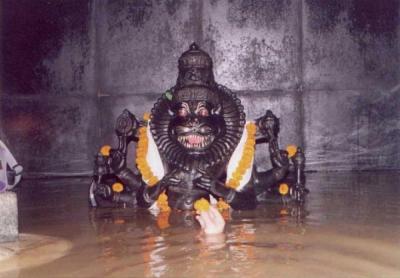 300 அடி நீளமுள்ள குகையைத் தாண்டி சென்றால்தான் நரசிம்மரை வழிபட முடியும். இது வெறும் குகை மட்டுமல்ல, எப்பொதும் நீரால் சூழந்திருக்கும் குகை. கோடை காலத்தில்கூட 4 அடி முதல் 5 அடி வரை குகையில் நீர் நிறைந்திருக்கும். குகைக்குள் சென்றால், மார்பளவு முதல் கழுத்துவரை தண்ணீர் இருக்கும். தண்ணீரில் நடந்தபடியே சென்றால்தான், கோயிலுக்கு செல்ல முடியும்.