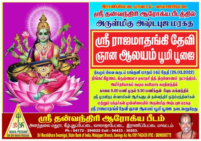 இராணிப்பேட்டை மாவட்டம், வாலாஜாபேட்டை, அனந்தலை மதுரா, கீழ்புதுப்பேட்டையில் உள்ள ஸ்ரீ தன்வந்திரி ஆரோக்ய பீடத்தில் நிகழும் பிலவ வருடம் பங்குனி மாதம் 14ம் தேதி 28.3.2022 திங்கட்கிழமை காலை 9.00 மணி முதல் 9.50 மணிக்கு கயிலை ஞானகுரு டாக்டர் ஸ்ரீ முரளிதர ஸ்வாமிகளின் அருளாசியுடன் அருள்மிகு அஷ்டபுஜ மரகத ஸ்ரீ ராஜமாதங்கி தேவி ஞான ஆலய பூமி பூஜை நடைபெற உள்ளது.