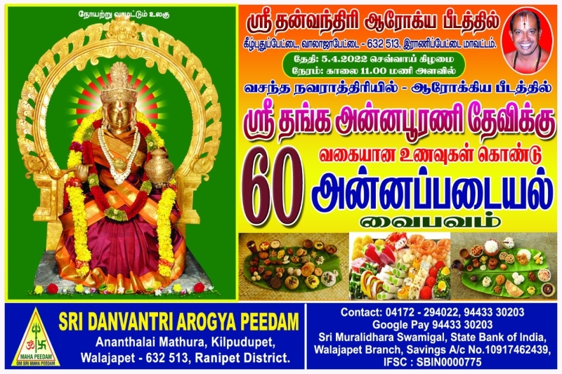 இராணிப்பேட்டை மாவட்டம், வாலாஜாபேட்டை, அனந்தலை மதுரா, கீழ்ப்புதுப்பேட்டையில் உள்ள ஸ்ரீ தன்வந்திரி ஆரோக்ய பீடத்தில் ஸ்தாபகர் மற்றும் பீடாதிபதி கயிலை ஞானகுரு டாக்டர் ஸ்ரீ முரளிதர ஸ்வாமிகளின் திருக்கரங்களால் பிரதிஷ்டை செய்யப்பட்ட 4 அடி உயரமுள்ள தங்க அன்னபூரணி தேவிக்கு பிரதி மாதம் பௌர்ணமி, அமாவாசை மற்றும் வெள்ளிக்கிழமை போன்ற தினங்களில் சிறப்பு பூஜைகள் நடைபெற்று வருகிறது அந்த வகையில் வசந்த நவராத்திரியை முன்னிட்டு ஸ்ரீ அன்னப்பூரணி தேவியின் அருள் அனைவருக்கும் கிடைக்க வேண்டி வருகிற 5.4.2022, செவ்வாய்கிழமை காலை 11.00 மணி அளவில் அன்னபூரணி ஹோமமும், அபிஷேகமும், சிறப்பு ஆராதனையும் செய்து சாதம், பருப்பு, நெய், பாயாசம், வடை, அப்பளம் போன்ற 60 வகையான உணவுப்பொருட்களை கொண்டு அன்னபூரணி தேவிக்கு அன்னப்படையல் வைபவமாக அன்னபூரணி சன்னதியில் நடைபெற உள்ளது.