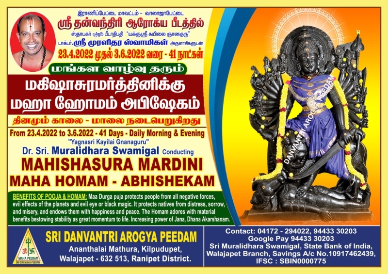 இராணிப்பேட்டை மாவட்டம், வாலாஜாபேட்டை ஸ்ரீ தன்வந்திரி ஆரோக்ய பீடத்தில் ஸ்தாபகர் மற்றும் பீடாதிபதி “யக்ஞஸ்ரீ கயிலை ஞானகுரு” டாக்டர் ஸ்ரீ முரளிதர ஸ்வாமிகள் அருளாசிகளுடன் வருகிற 23.04.2022 சனிக்கிழமை முதல் 3.6.2022 வெள்ளிக்கிழமை வரை 41 நாட்கள் தினமும் காலை முதல் மாலை வரை அக்னி நக்ஷத்திரத்தின் தாக்கம் குறையவும், மழை வேண்டியும், இயற்கை வளம் வேண்டியும், மரண பயம் நீங்கவும், மாங்கல்ய தோஷம் அகலவும், திருமணம் பாக்கியம் கைகூடவும், சந்தானம் பாக்கியம் பெறவும், தொழில் வியாபாரம் சிறக்கவும், தன ஆகர்ஷண மற்றும் ஜன ஆகர்ஷண பெருகவும், சகலவிதமான பயங்கள், தோஷங்கள் விலகி வாழ்க்கையில் வெற்றிகளை பெறவும், சர்வ மங்களம் பெற்று மங்கள வாழ்வு பெறவும் மகிஷாசுரமர்த்தினிக்கு மஹா அபிஷேகம் நடைபெற உள்ளது.