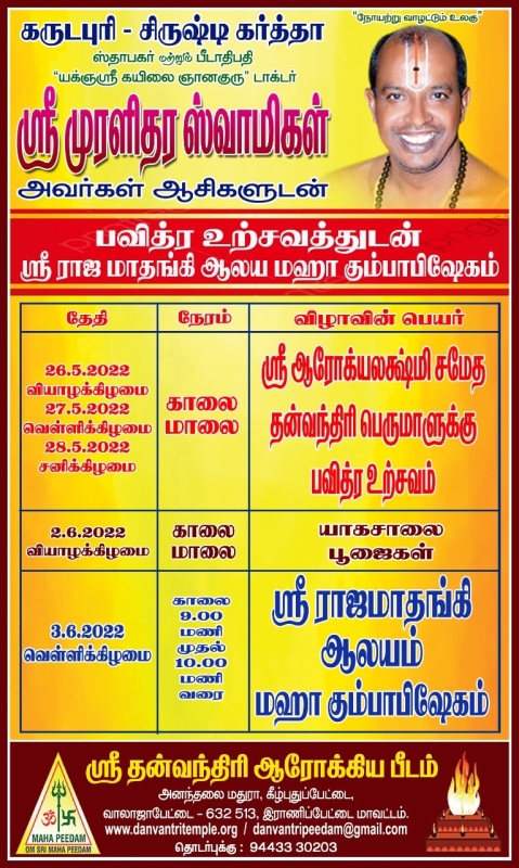 இராணிப்பேட்டை மாவட்டம் வாலாஜாபேட்டை ஸ்ரீ தன்வந்திரி ஆரோக்ய பீடத்தில் யக்ஞஸ்ரீ கயிலை ஞானகுரு டாக்டர் ஸ்ரீ முரளிதர ஸ்வாமிகளின் அருளாணைப்படி வருகிற 26.05.2022 வியாழக்கிழமை முதல் 28.05.2022 சனிக்கிழமை வரை ஸ்ரீ ஆரோக்யலக்ஷ்மி சமேத தன்வந்திரி பெருமாளுக்கு பவித்ர உற்சவம் மஹோத்சவமாக நடைபெறவுள்ளது.