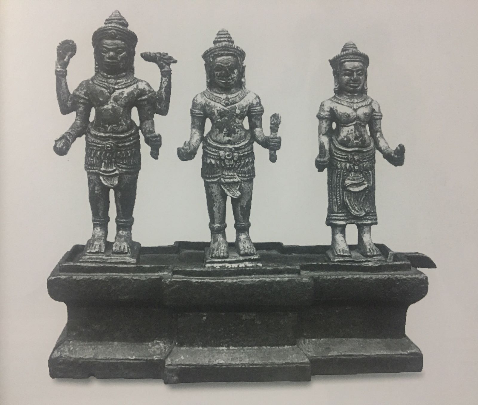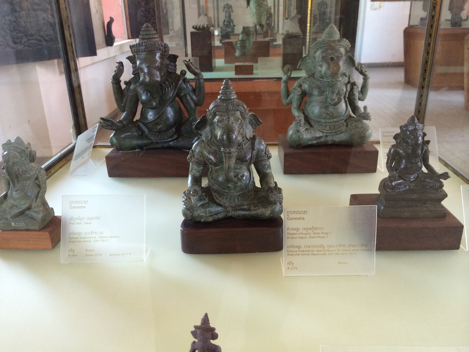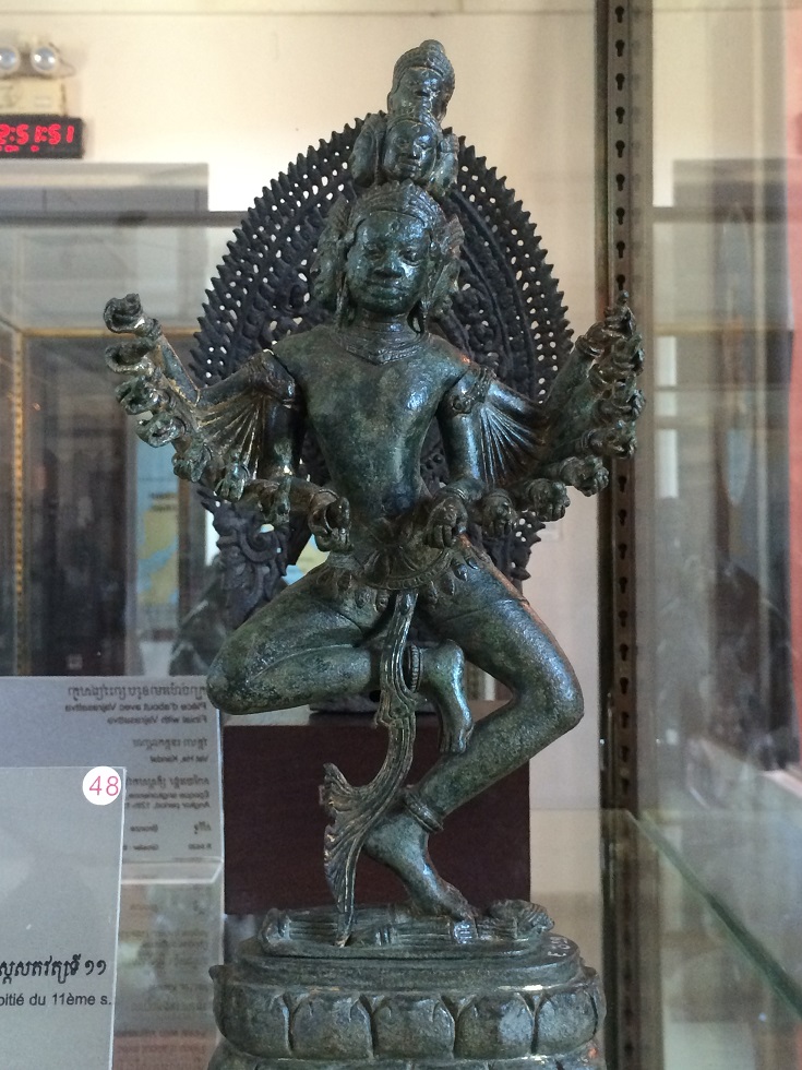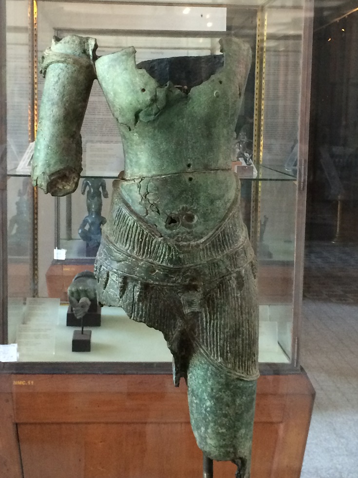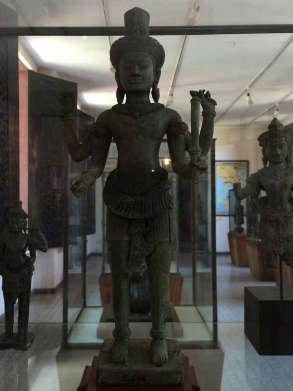 அரும்பொருளகத்தின் கிழக்குப் புறக் காட்சிக்கூடத்திலிருந்து நாங்கள் சுற்றிப் பார்க்கத் தொடங்கினோம். கிடந்தகோல விஷ்ணுவைப் பார்க்குமுன், கண்ணாடிப் பெட்டிகளில் பலவிதமான உலோகத் திருமேனிகள் இருந்தன. எல்லாமே கம்போடியாவின் பல பகுதிகளில் இருந்து திரட்டப்பட்டு இங்கே காட்சிக்கு வைக்கப்பட்டுள்ளன. சில பெரிய திருமேனிகள் தனியான கண்ணாடிப் பெட்டியிலும், சிறிய திருமேனிகள் இரண்டு அடுக்குக் கண்ணாடிப் பெட்டியிலும் வைக்கப்பட்டிருந்தன.