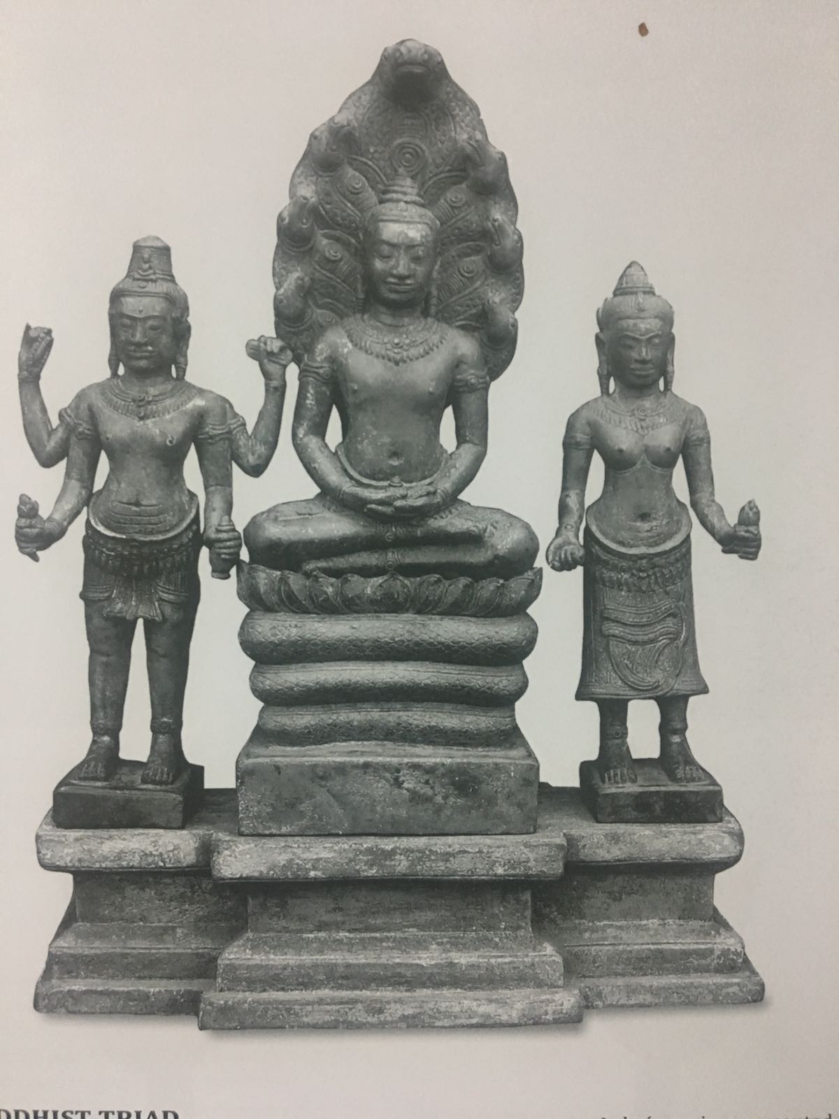 ஆவுடையார் மீது நிற்கும் நிலையில் மூன்று திருமேனிகள் உள்ளன. சிவா, விஷ்ணு, லட்சுமி என்கிறது கையேடு. விஷ்ணுவுக்கு சங்கு, சக்கரம் ஏந்திய நான்கு கரங்கள். சிவனுக்கு இரண்டு கரங்கள். ஒன்றில் திரிசூலம். மற்றொன்று என்னவென்று அடையாளங்காண முடியவில்லை. இதே போல் பௌத்தத் திருமேனிகள் மூன்று உள்ளன ஒரே பீடத்தில். நடுவே நாகபுத்தர். பாம்பணை மேல் பத்மபீடத்தில் பத்மாசனத்தில் அமர்ந்த கோலம். புத்தருக்கு வலப்பக்கத்தில் லோகேஸ்வரர் நான்கு கரங்களோடு. இடப்பக்கத்தில் பிரஜ்னபரம்பிதா. இவர் நமக்குப் புதியவர். மஹாயான பௌத்தத்தில், முழுமை பெற்ற விவேகி என்ற பொருளாம் இந்தப் பெண் தெய்வத்துக்கு. இந்தத் திருமேனி வலக்கையில் சுவடிக்கட்டும் இடக் கையில் தாமரை மொக்கும் வைத்திருக்கிறது. வாக்தேவி ??? 13ஆம் நூற்றாண்டுத் திருமேனி இது. வித்தியாசமானது நமக்கு. தனித் தனியாகச் செய்து பொதுவான பீடத்தில் அமர்த்தியுள்ளனர் இந்தத் திருமேனிகளை.