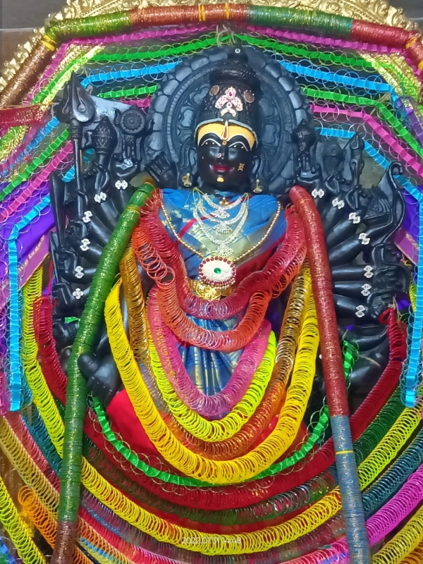 வாலாஜா ஸ்ரீ தன்வந்திரி பீடத்தில் ஆடிப்பூரத்தை முன்னிட்டு 9 அடி உயரமுள்ள ஸ்ரீ மகிஷாசுர மர்த்தினி தேவிக்கு 21,000 வளையல்கள் கொண்டு சிறப்பு அலங்காரம்