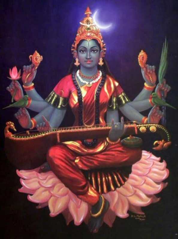 மாணிக்கமயமான வீணையை வாசிப்பவளும், அழகான வாக்கு உடையவளும், நீலநிற ஒளி பொருந்திய உடலினளும், மதங்க முனிவரின் மகளுமான இவள் அருள் இருந்தால் அனைத்து கலைகளும் லகுவாகும்.